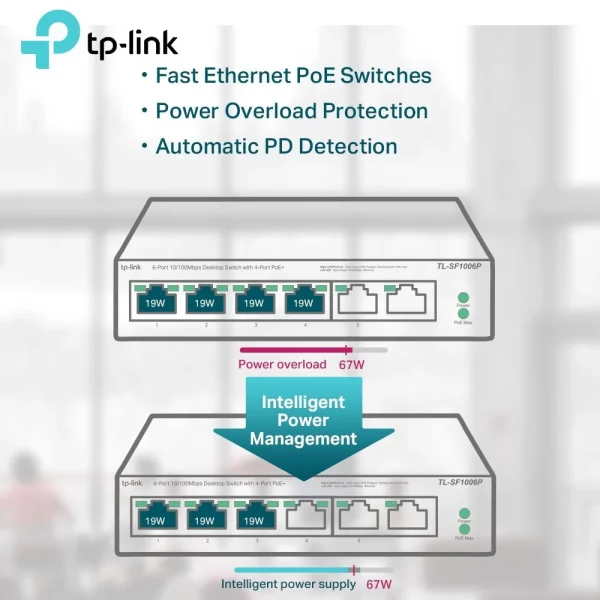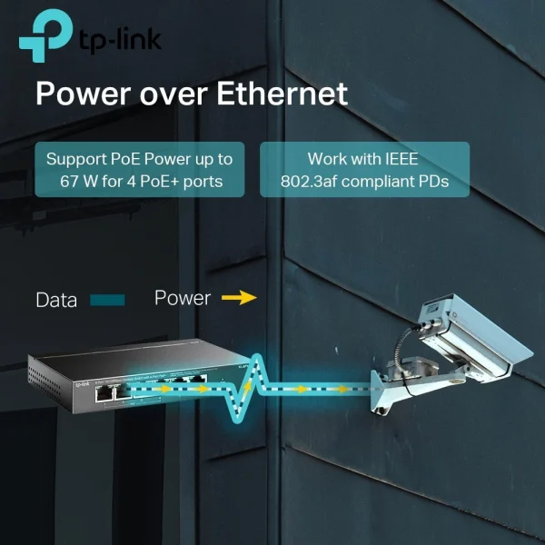 سوییچ SF1006P تی پی لینک یک سوییچ 6 پورت هوشمند با قابلیت PoE است که برای نصب و راهاندازی سیستمهای نظارت تصویری و شبکههای کوچک طراحی شده است. این دستگاه با پشتیبانی از استاندارد IEEE 802.3af/at تا توان 67 وات را به دستگاههای متصل انتقال میدهد، بدون نیاز به کابلکشی اضافی برای برقرسانی.